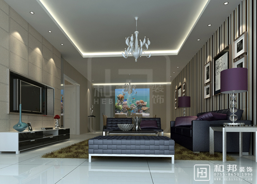 | 設(shè)計(jì)說(shuō)明 | 客廳的沙發(fā)墻面的線條與電視墻的墻面有著“天輕地重”的舒適視覺(jué)感,抱枕使用了紫色,與黑色沙發(fā)的相得益彰很舒適、溫和,這種裝飾效果形成對(duì)比的層次美感。 | ||||
